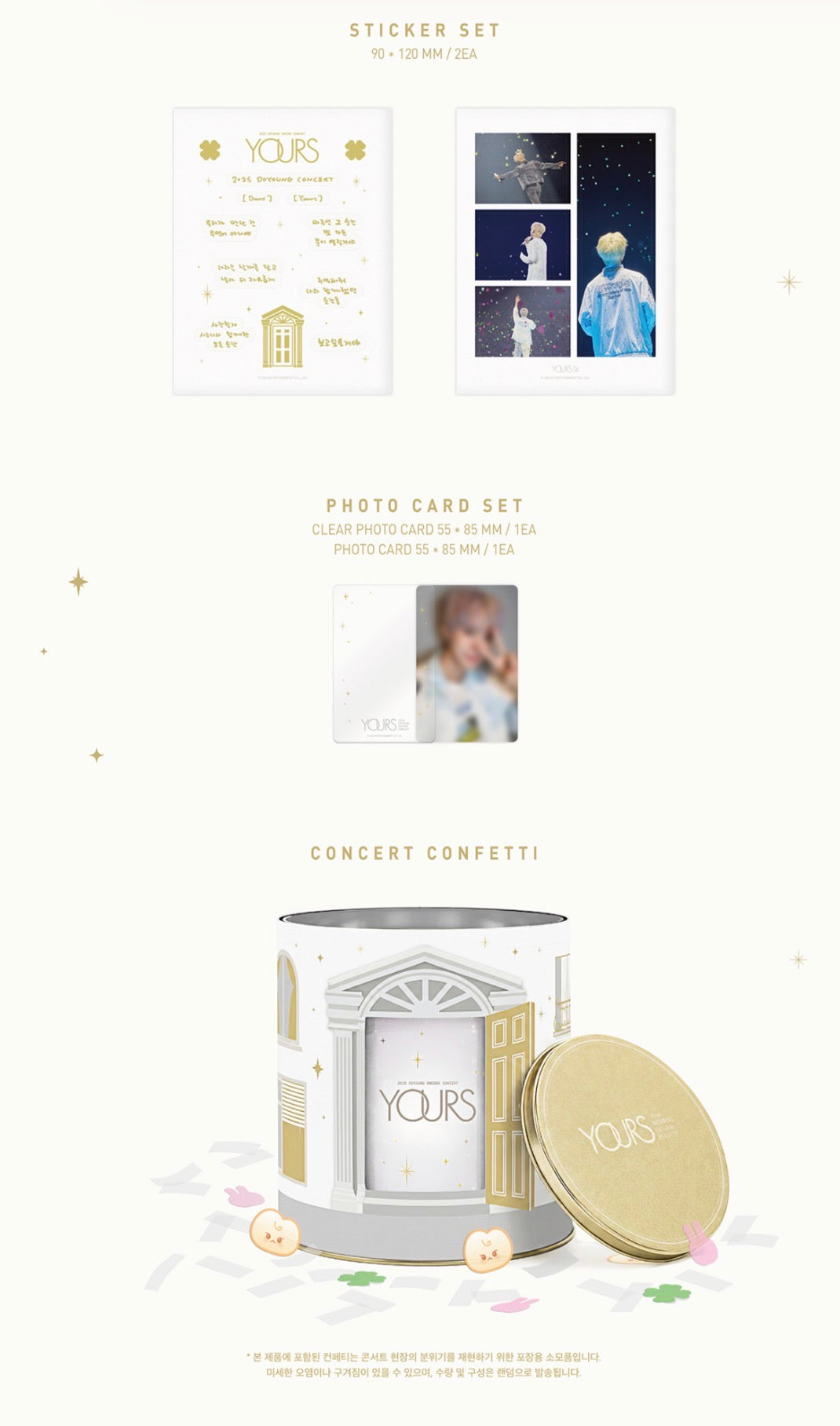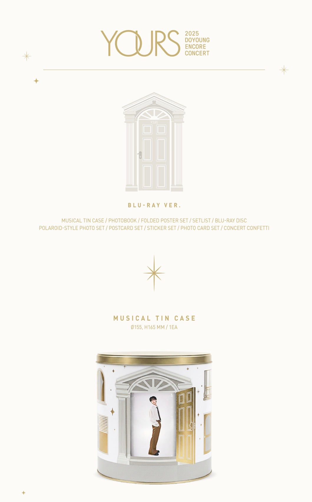 ★ CONTENT:2ea Blu-ray Disc(about 178 mins)+1ea Musical Tin Case+112p Photo Book +1ea Folded Poster Set(1set 2ea)+1ea Setlist+1ea Polaroid Photo Set(1set 3ea)+1ea Post Card Set(1set 4ea) +1ea Sticker Set(1set 2ea)+1ea Photo Card Set(1set:1ea Clear Photo Card+1ea Photo Card)
