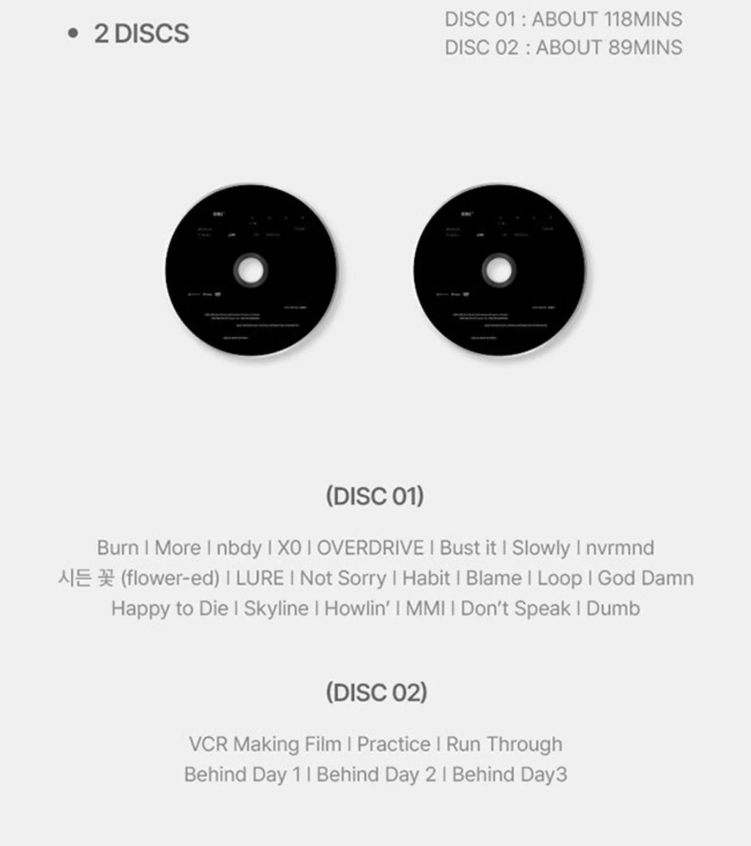 Package:OUTBOX: 166*228*33mm DIGIPACK : 160*220mm 2DISCS PHOTOBOOK: 160*220 mm (124P) FOLDED POSTER: 440*320mm STICKER: 102*152mm POSTCARD SET: 102*152mm (4EA 1SET) PHOTOCARD SET : 55*85mm (2EA 1SET)