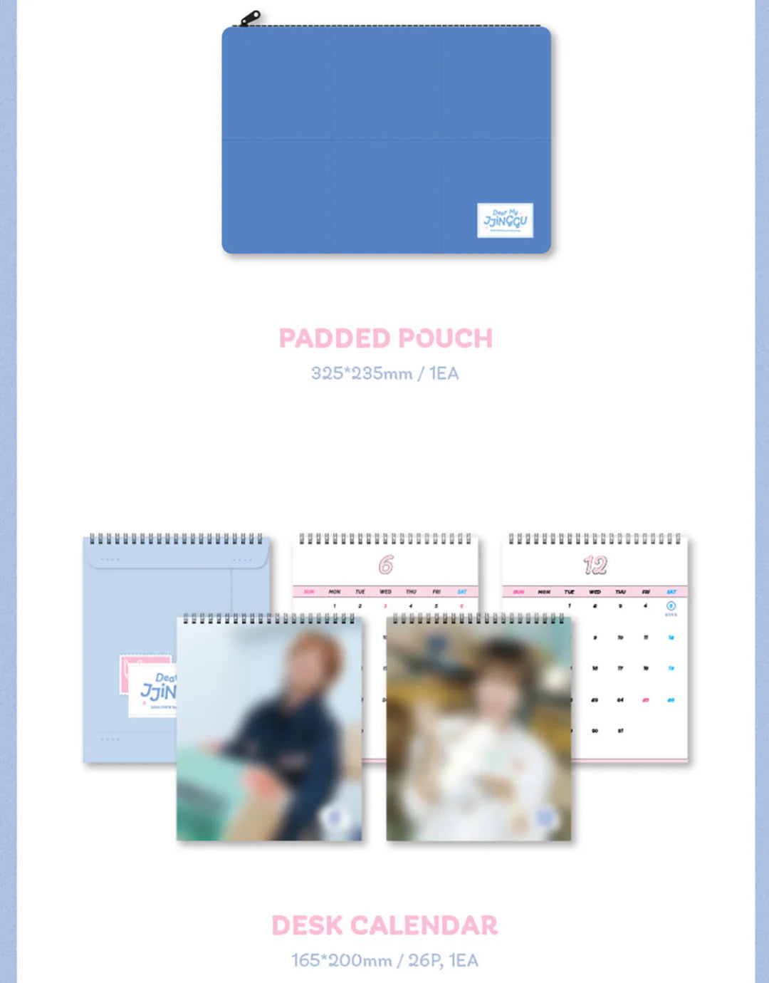 Components :1ea padded bag + 26p desk calendar + 36p photo book + photo card set 1ea (1 set 3ea)+1ea Message Card +1ea Sticker Set (1set 2ea) + 1ea Masking Tape