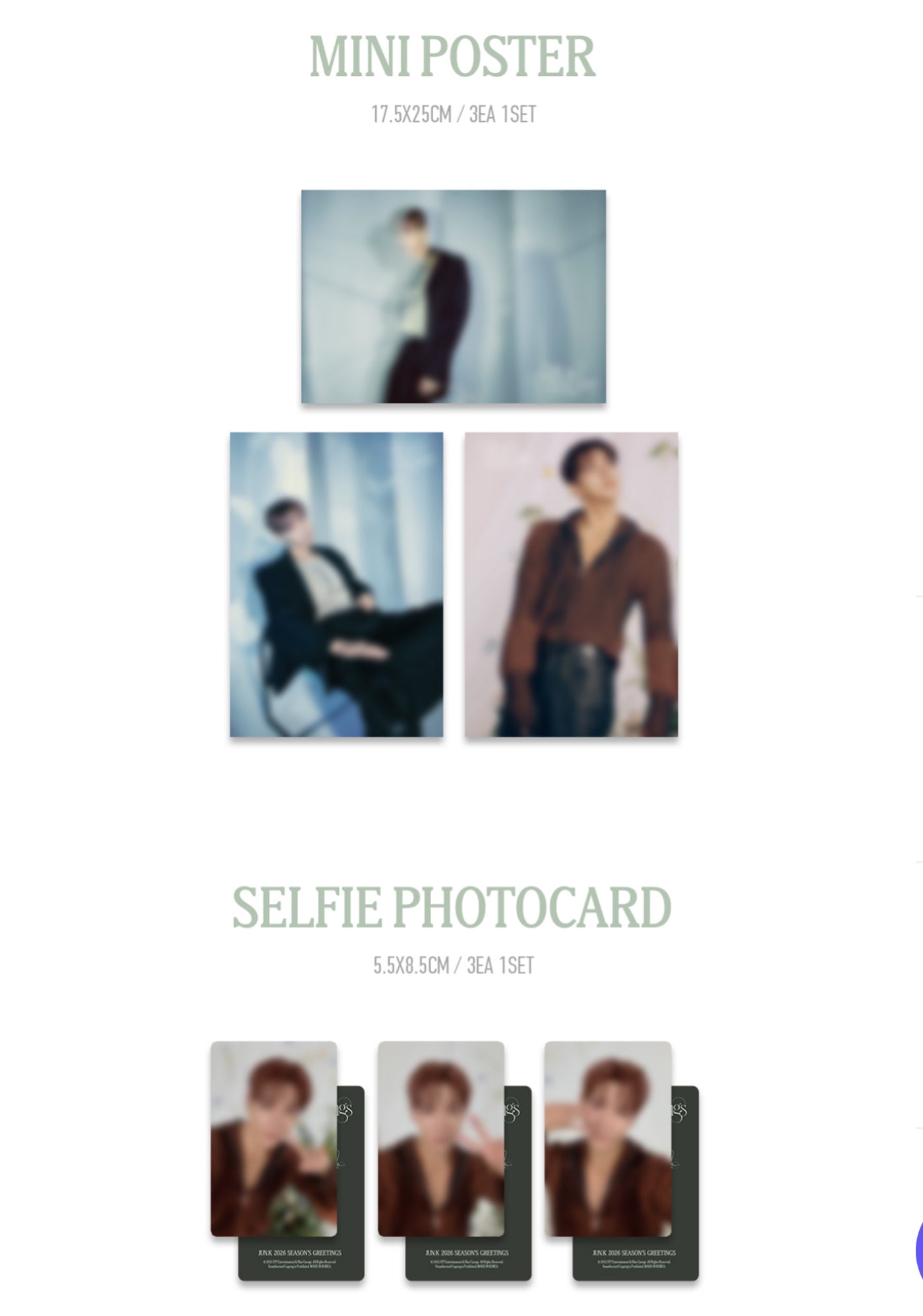 Components :1ea Desk Calendar+1ea Diary+1ea Mini Poster Set(1set 3ea/On pack)+1ea Selfie Photo Card Set(1set 3ea)+1ea Removable Sticker Set(1set 2ea) +1ea Memo Pad+1ea PVC Clear Pouch+1ea ID Photo Set(1set 3ea)+1ea Polaroid Card Set(1set 3ea)+1ea Message Card Set(1set 3ea)+1ea Lenticular Card