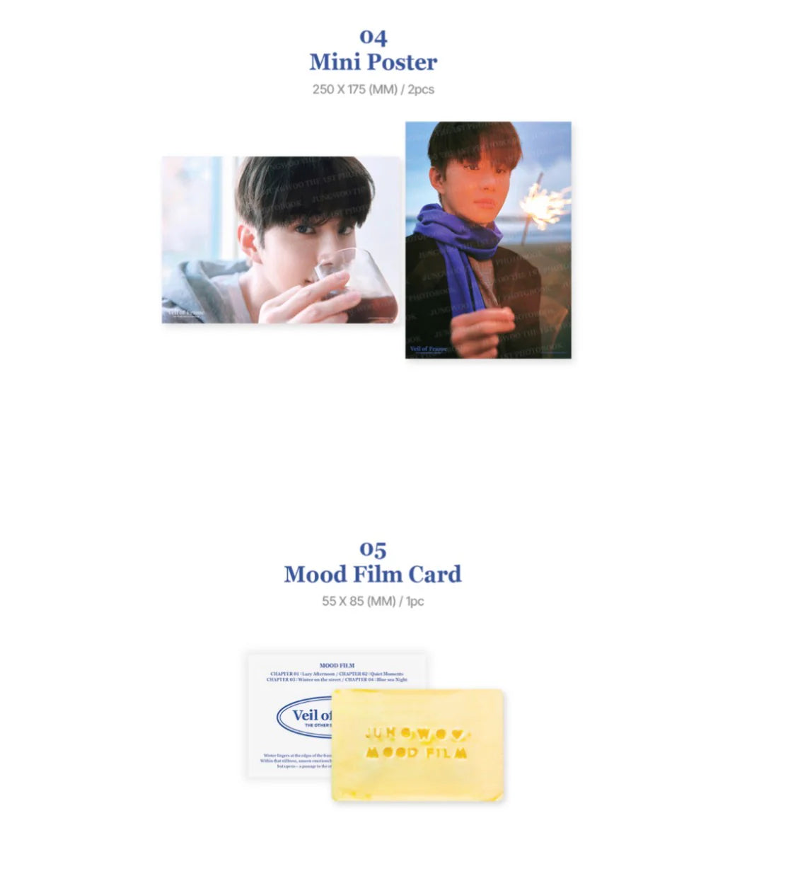 Content:188p Photo Book+1ea Veil Archive+4ea Frame Card+2ea Mini Poster+1ea Mood Film Card +4ea Film Photo+1ea Jungwoo Letter Set(1ea Letter Envelope+1ea Letter Post Card+1ea Selfie Photo Card)+2ea Selfie Photo Card